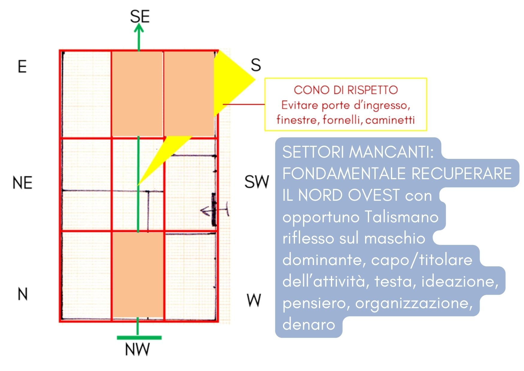 • verificare gli orientamenti e la presenza soprattutto dei settori ovest, nord ovest e nord, con energie Metallo e Acqua, fondamentali per la salute e la creatività (lavoro, guadagni) di Marco